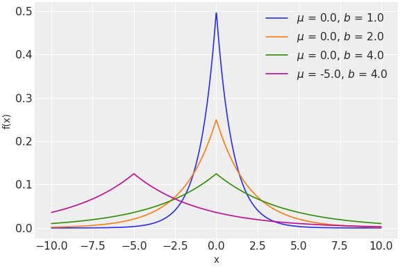 \[f(x \mid \mu, b) = \frac{1}{2b} \exp \left\{ - \frac{|x - \mu|}{b} \right\}\]